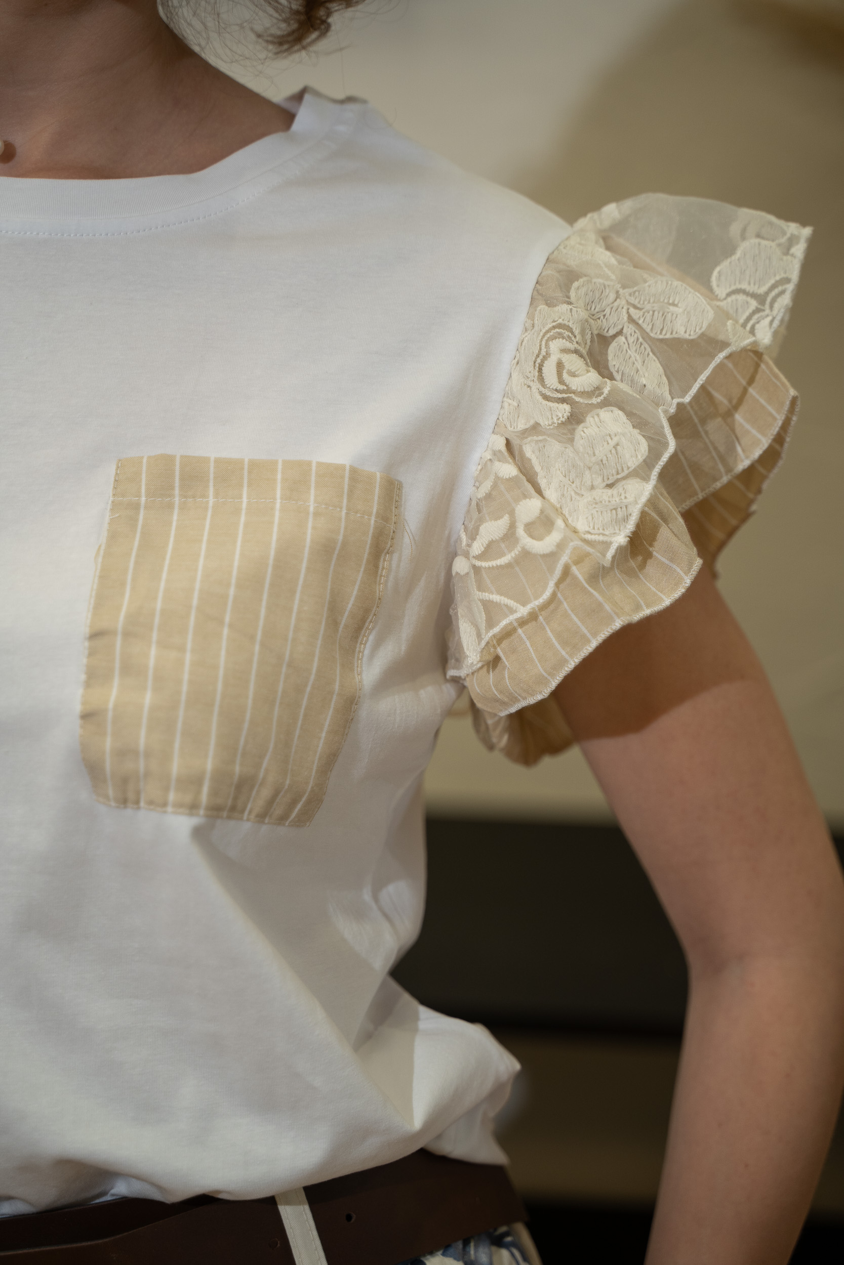 Tricou alb simplu, cu mâneci în nuanțe calde de matcha, ce adaugă un contrast delicat și stilat. Confortabil și versatil, ideal pentru ținute casual și relaxate în orice sezon.
