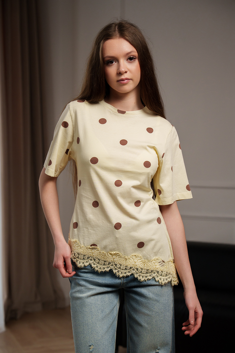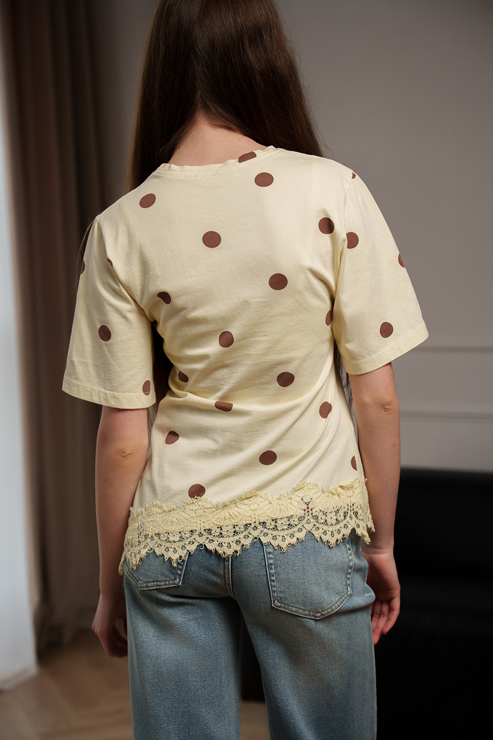 Home Imbracaminte Bluze și tricouri Tricou asimetric galben cu buline și dantelă