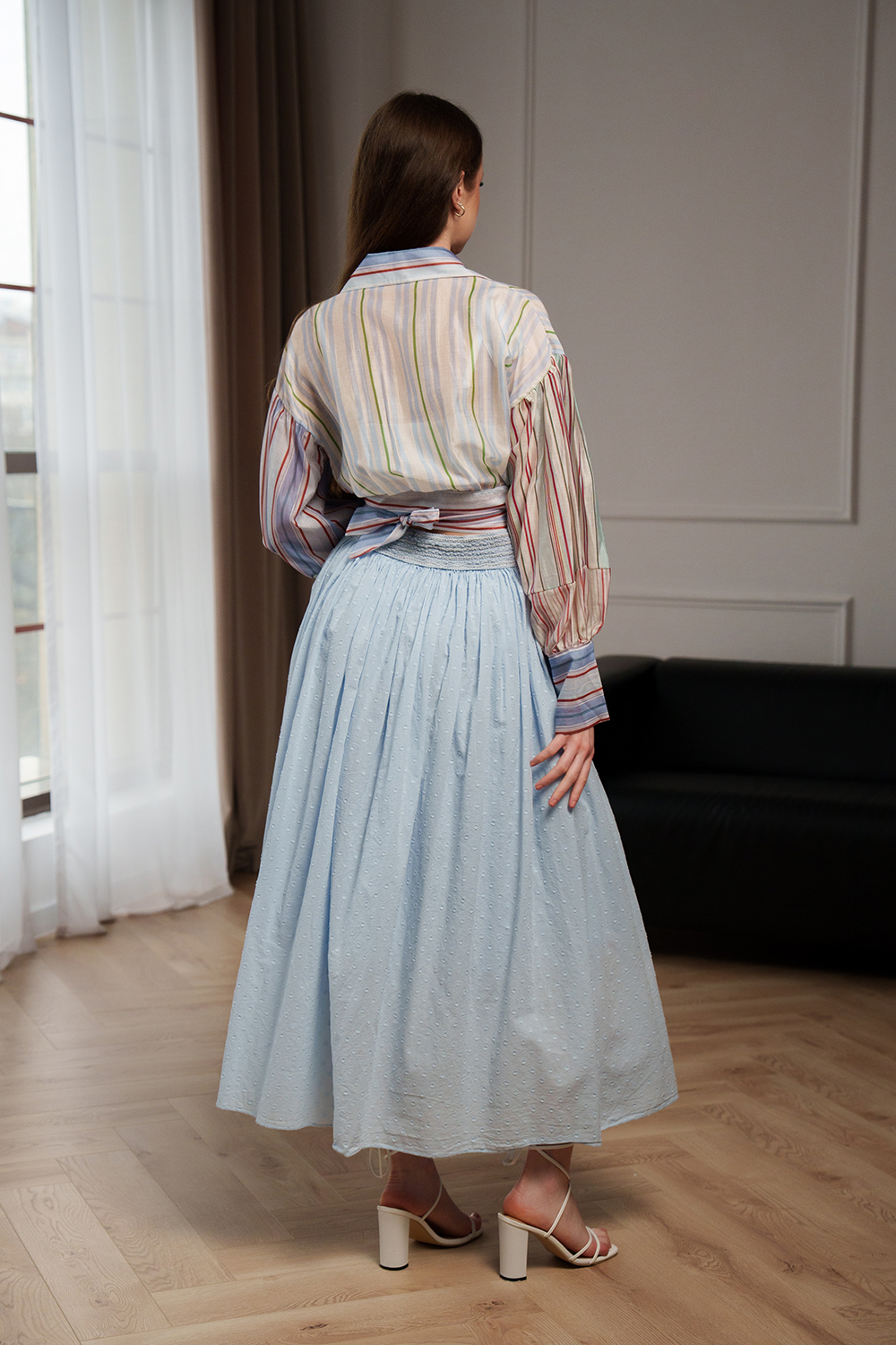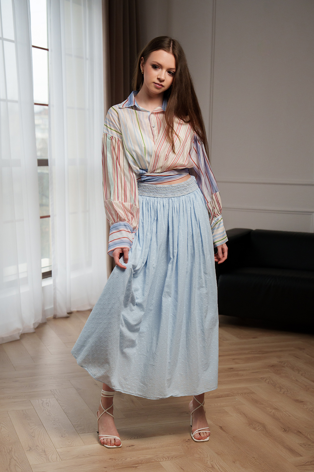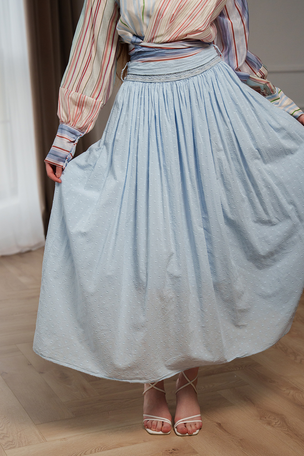 Fustă bleu, cu croială amplă și talie elastică pentru confort. Prevăzută cu un cordon în talie, este realizată dintr-un material ușor, cu textură fină, ce oferă un aspect elegant și feminin.