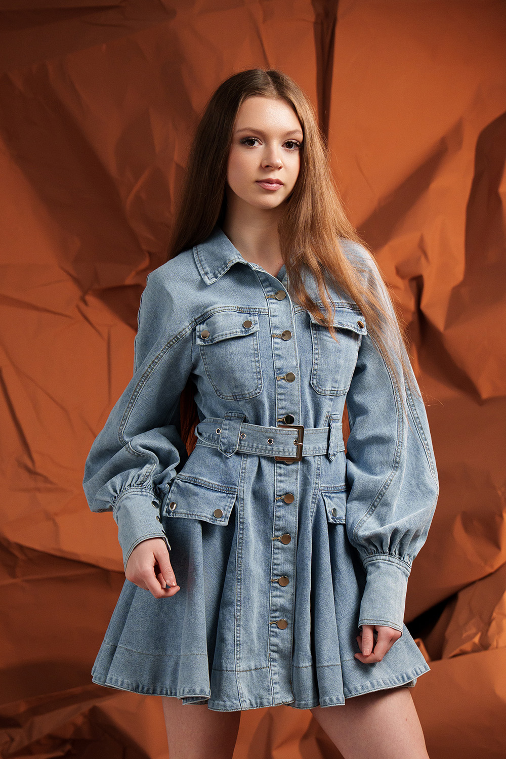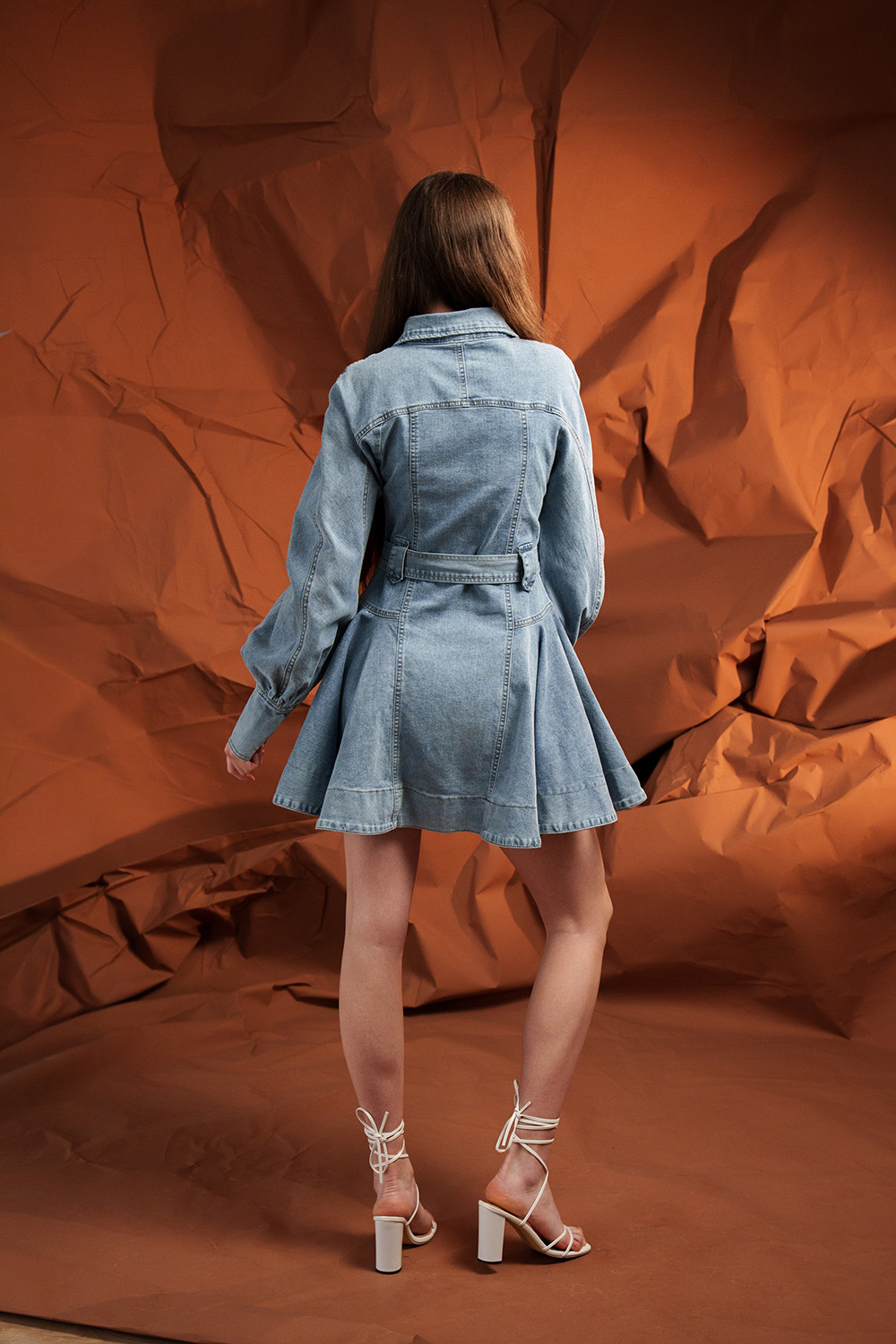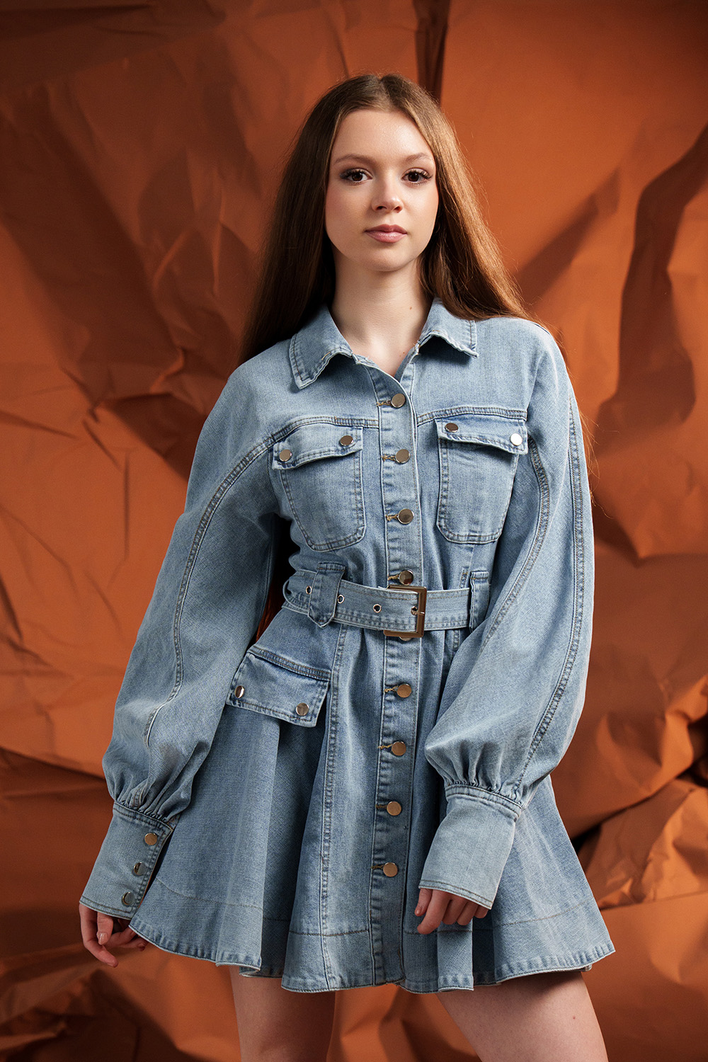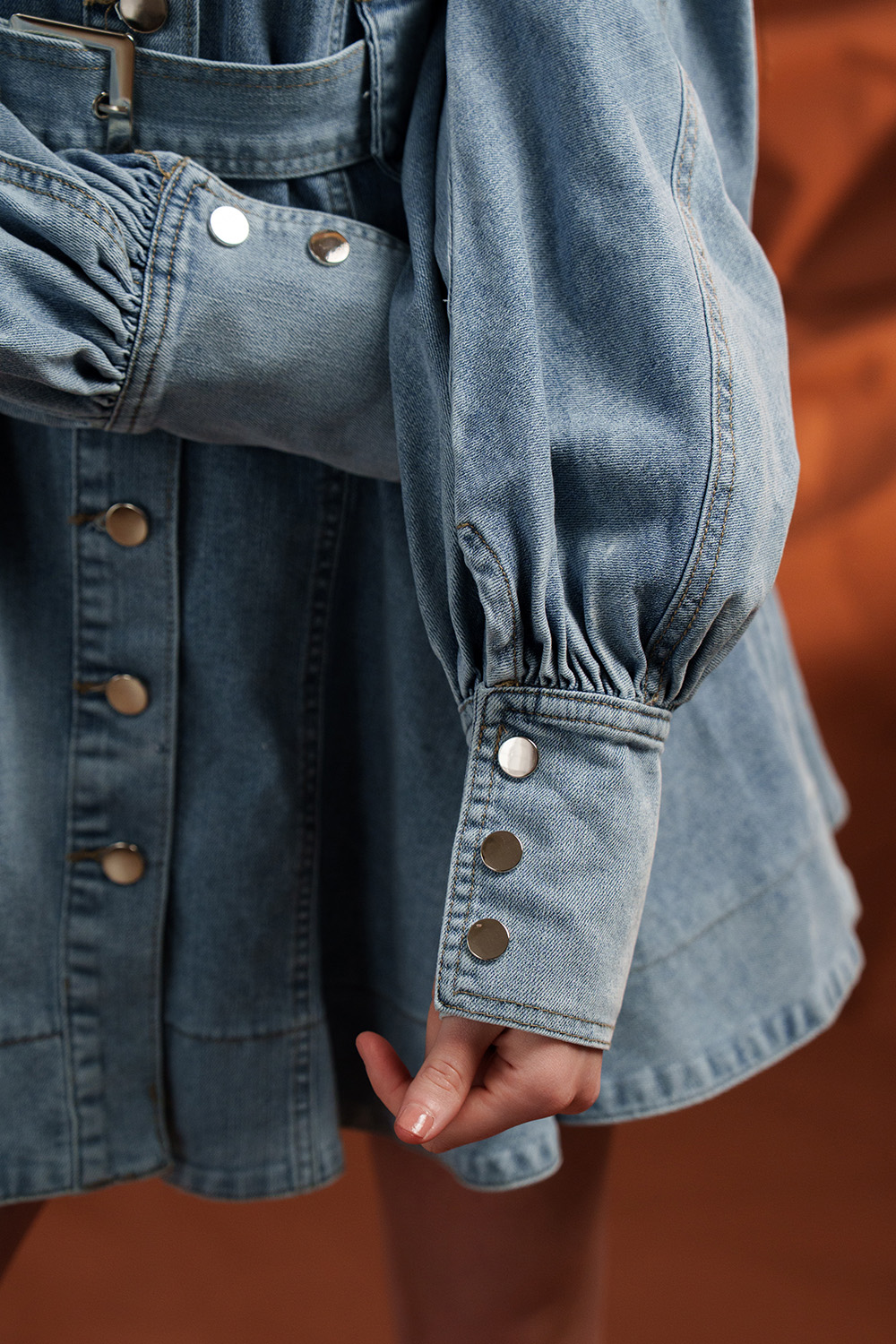 Rochie din denim, cu croială ajustată pe corp, care pune în valoare silueta. Talie definită prin cordon, buzunare practice și nasturi metalici ce adaugă un detaliu rafinat. Mâneci cu mansetă strâmtă pentru volum elegant.