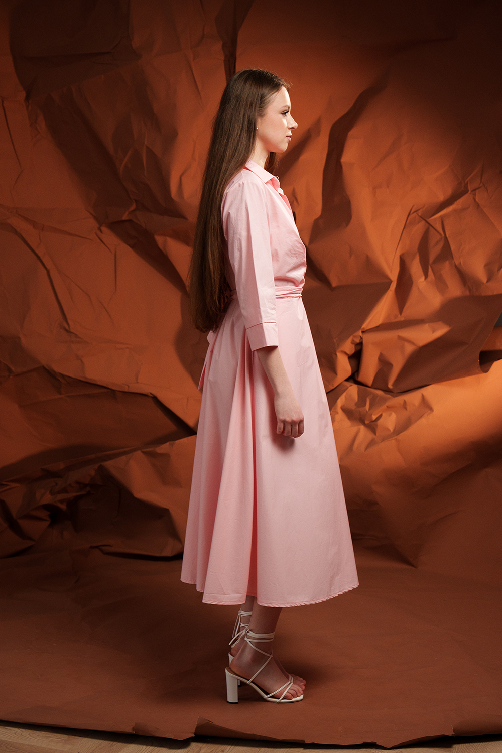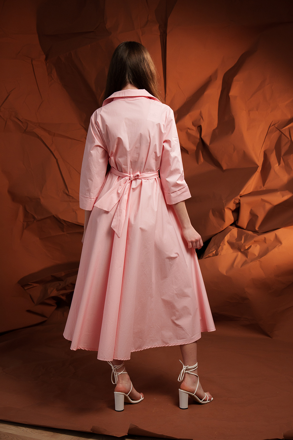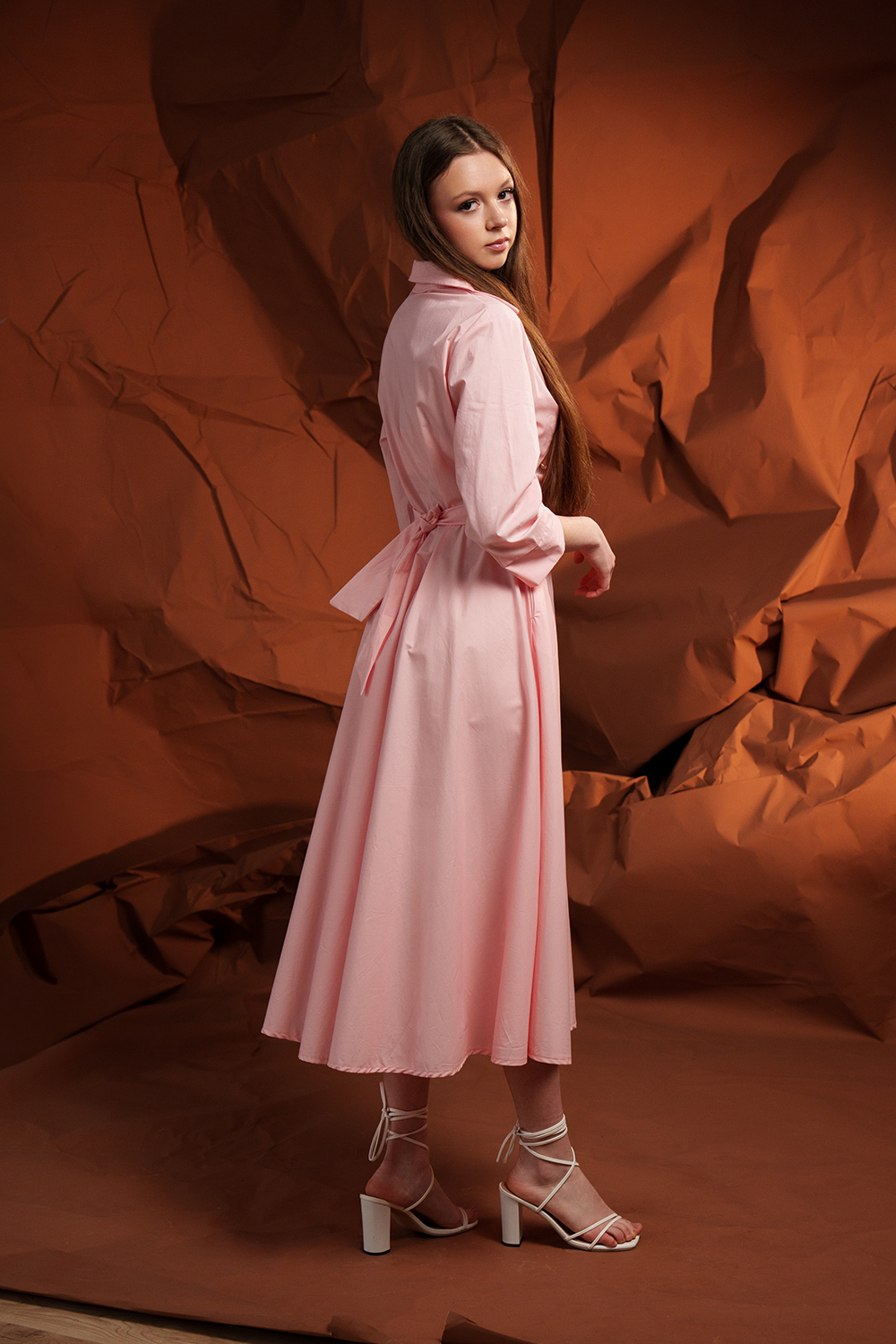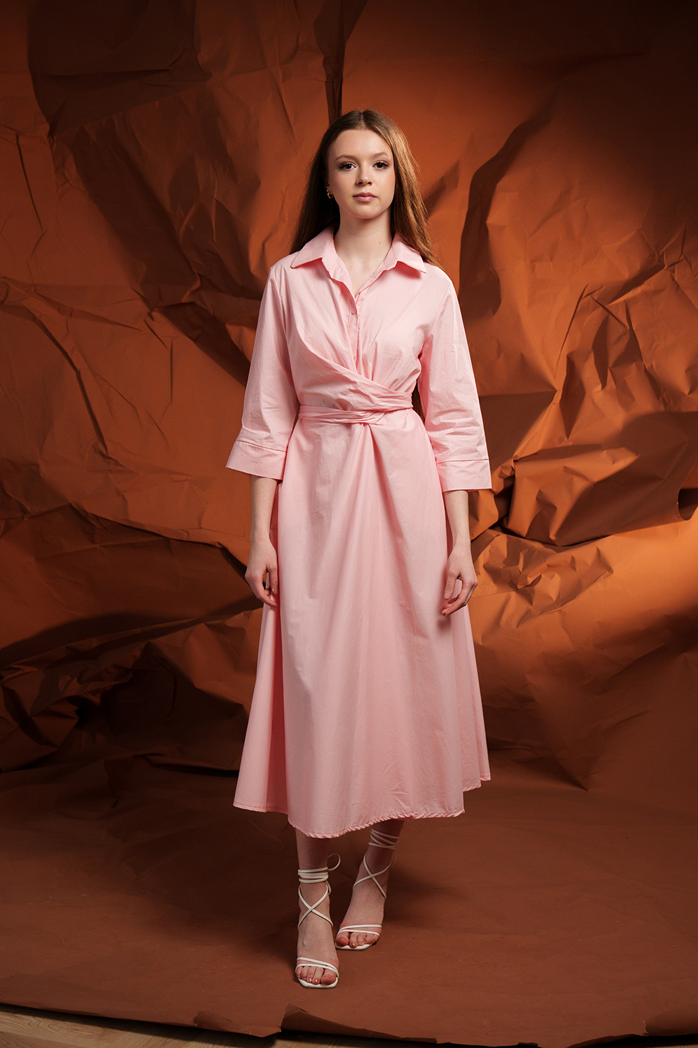 Rochie lungă roz, cu croială fluidă și cordon integrat în talie, care evidențiază silueta. Realizată din bumbac ușor, cu buzunare practice, oferă confort și mișcare, potrivită pentru ținute elegante și relaxate.