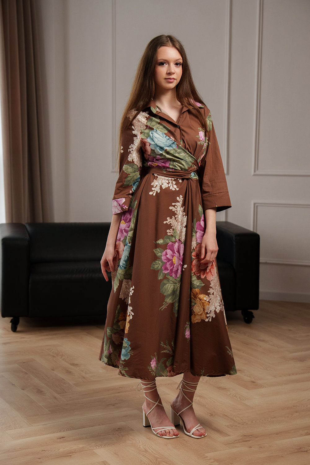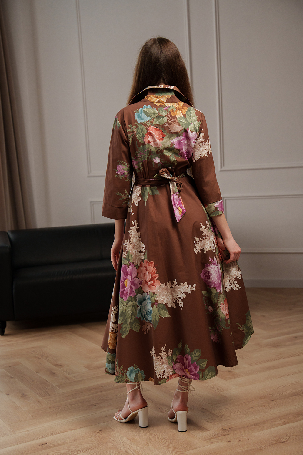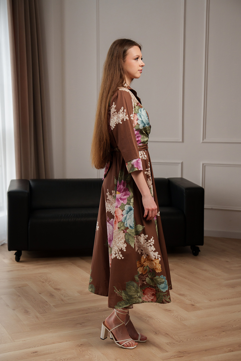 Rochie lungă maro cu imprimeu floral, croială fluidă și cordon integrat în talie pentru evidențierea siluetei. Material ușor și confortabil, potrivit pentru ținute elegante sau casual.