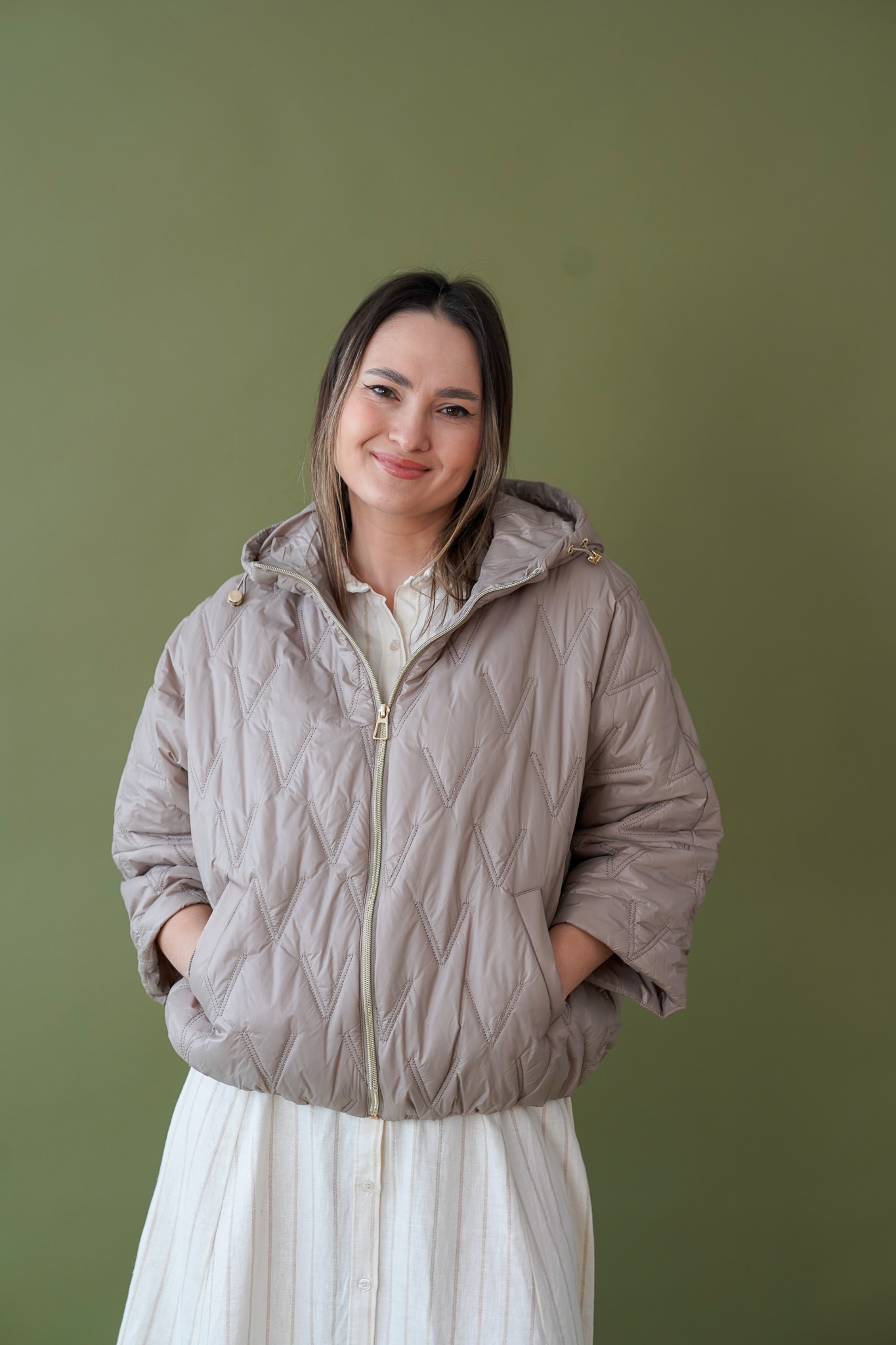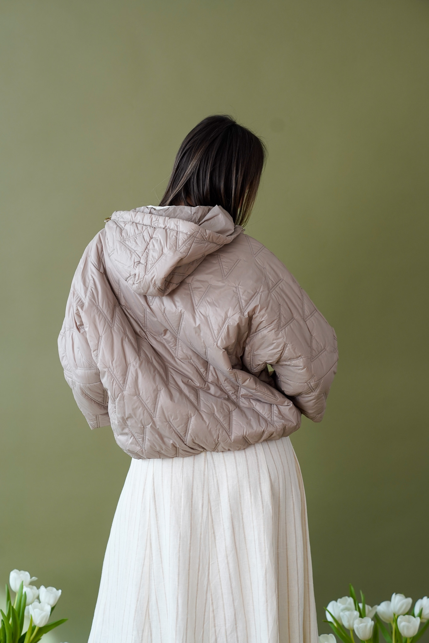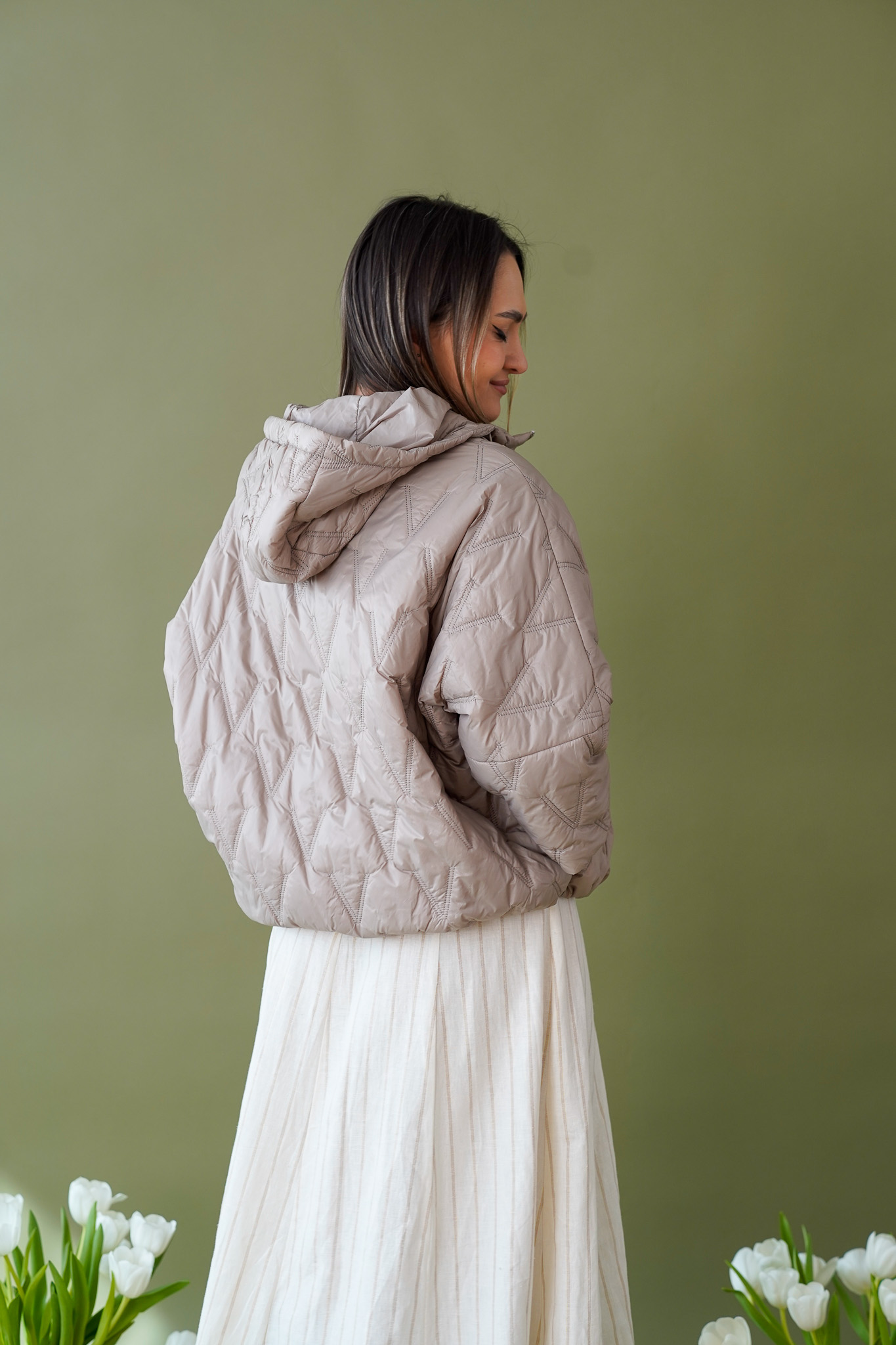 Geacă matlasată bej ușoară și confortabilă, cu glugă și talie elastică. Ideală pentru zilele răcoroase.