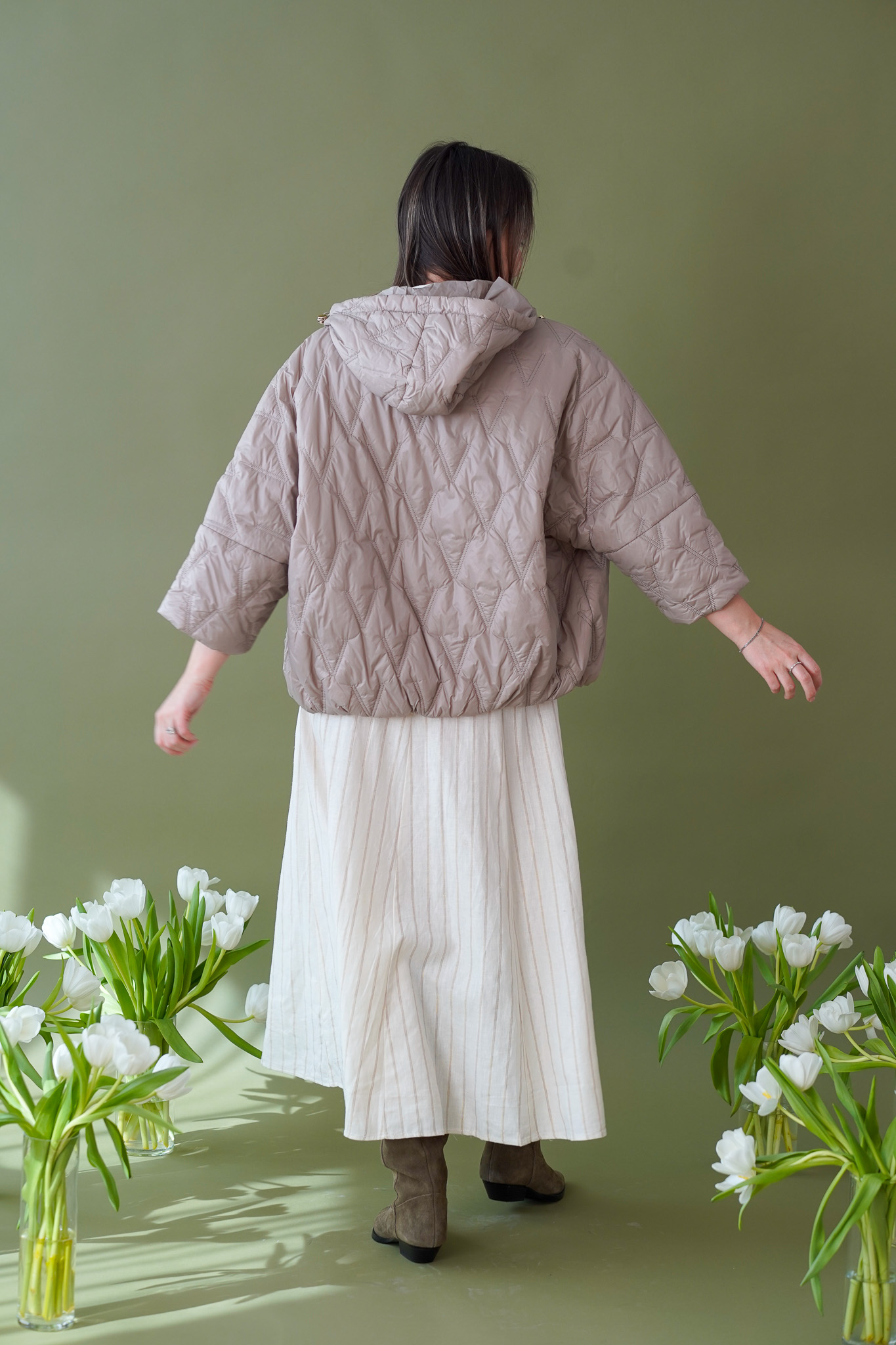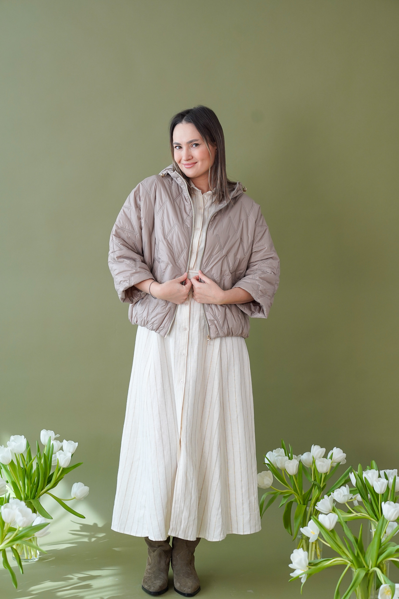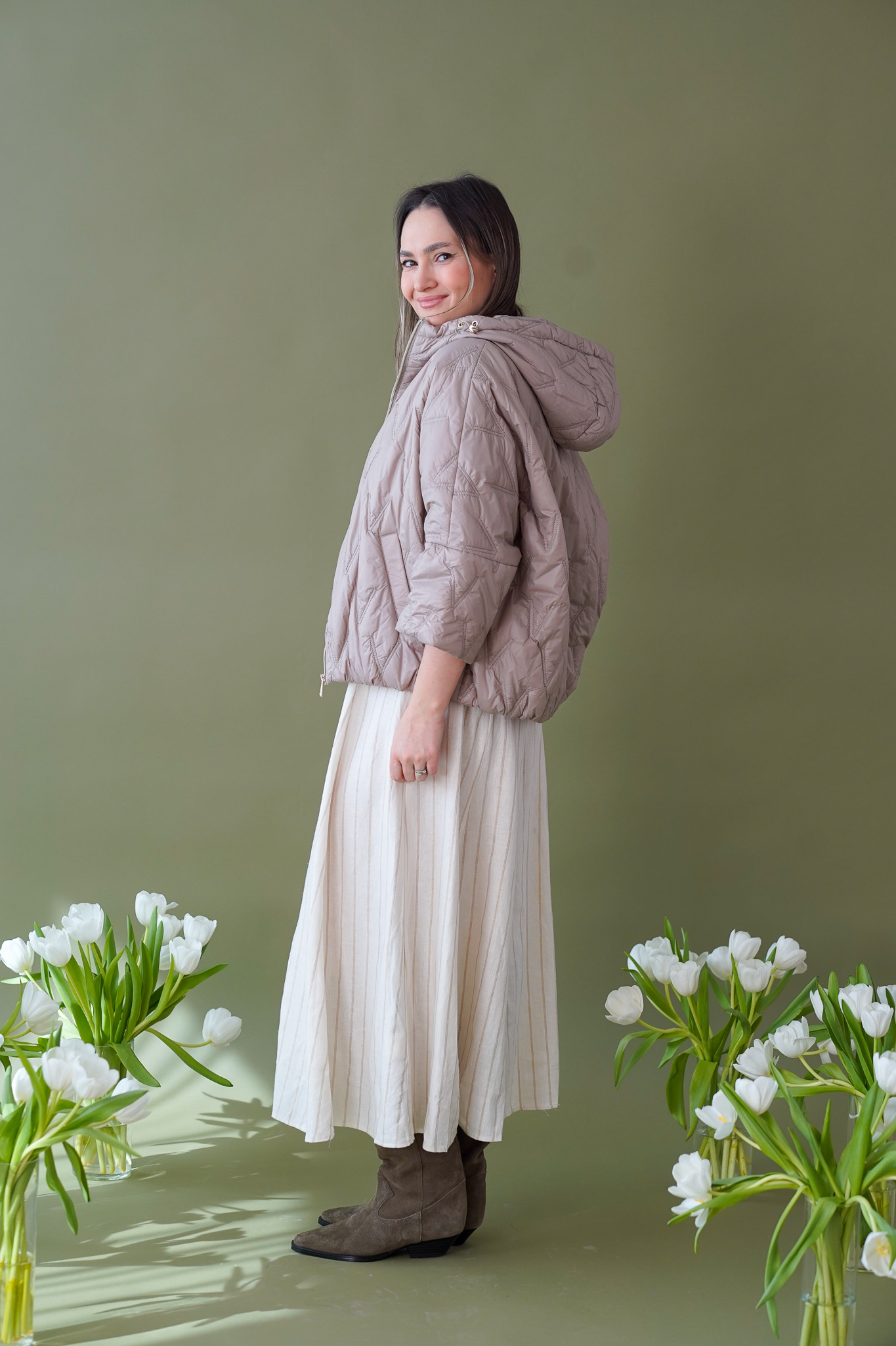 Geacă matlasată bej ușoară și confortabilă, cu glugă și talie elastică. Ideală pentru zilele răcoroase.