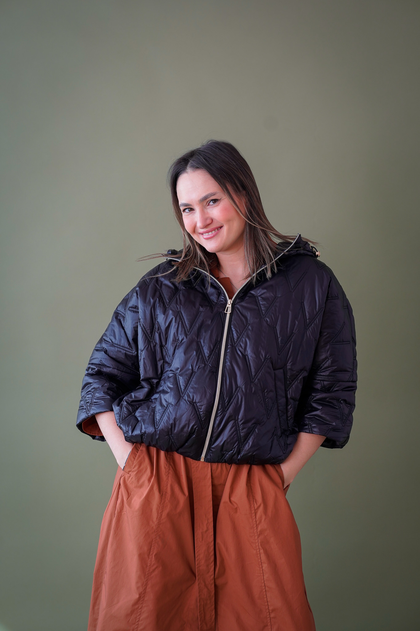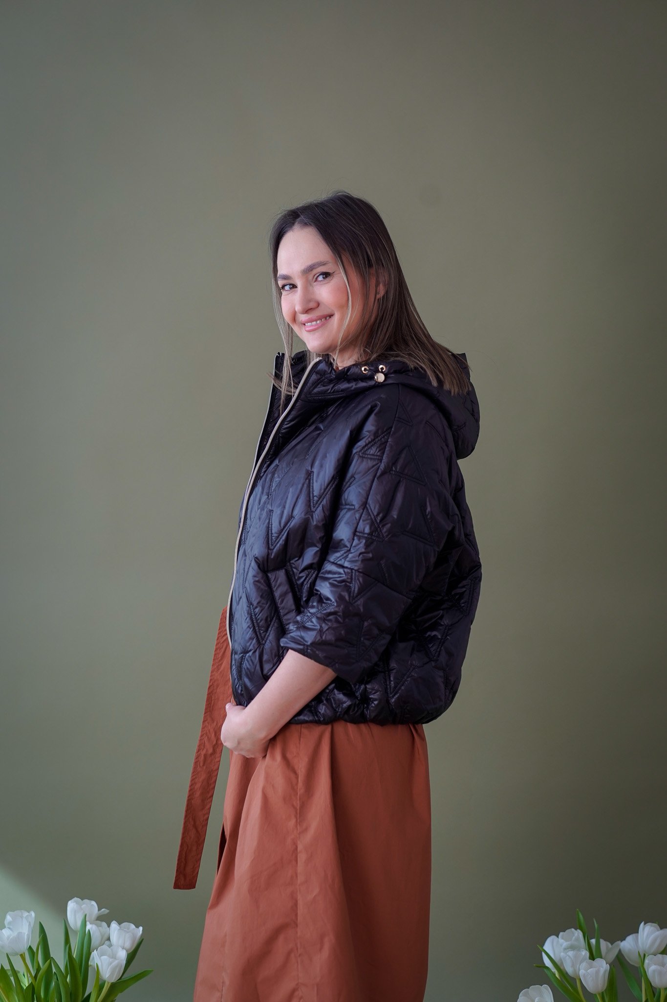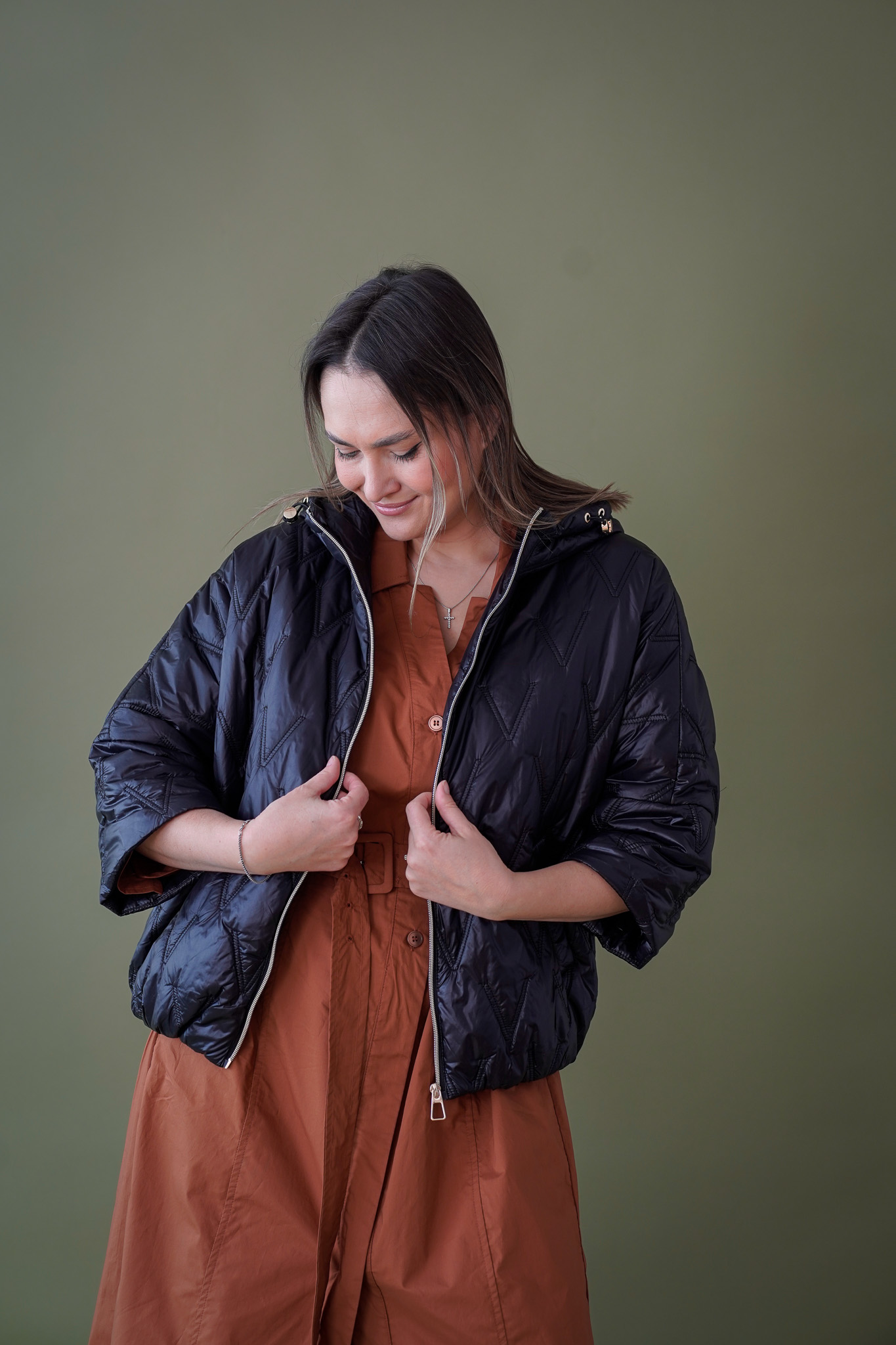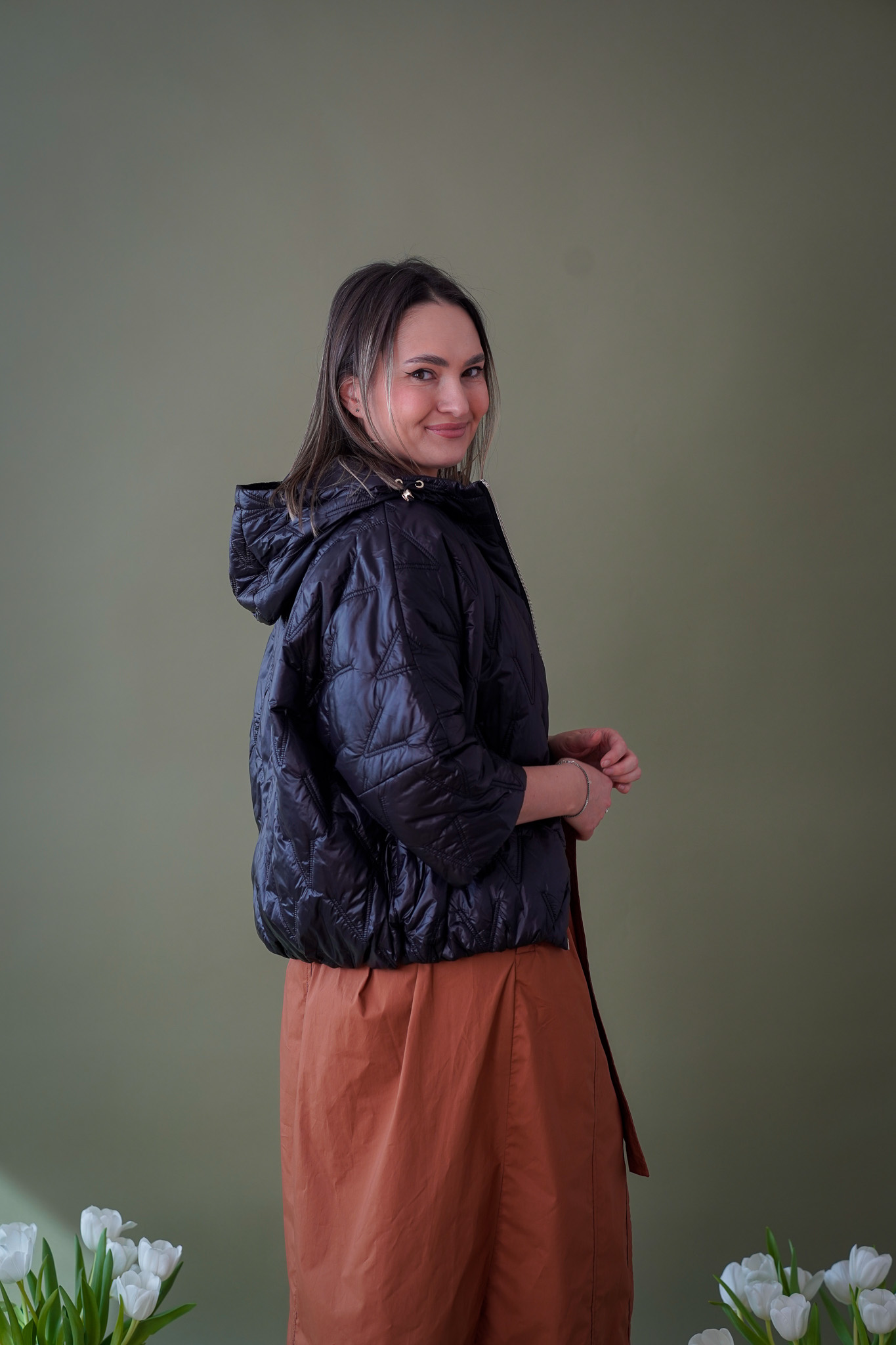 Geacă într-o nuanță de negru, potrivită pentru sezonul de tranziție. Model lejer, prevăzut cu glugă și închidere prin capse. Elasticul din partea de jos oferă o fixare mai bună și un plus de confort la purtare.
