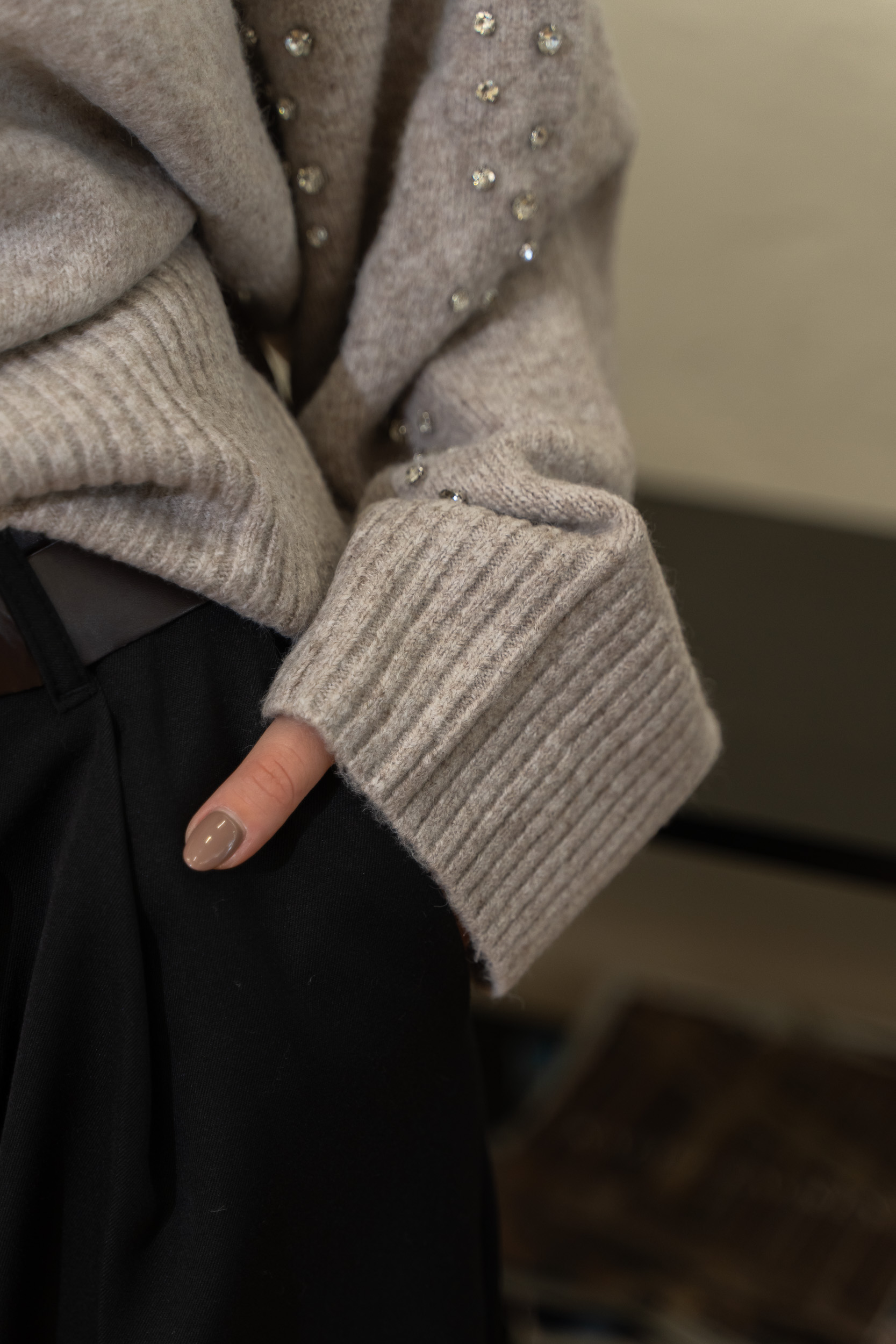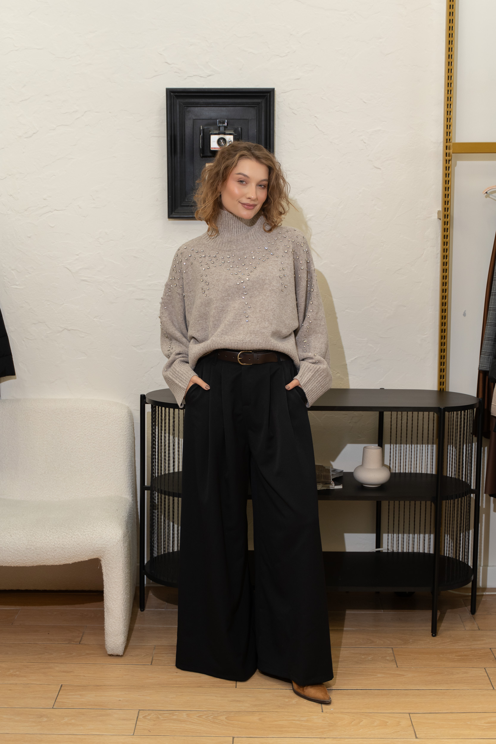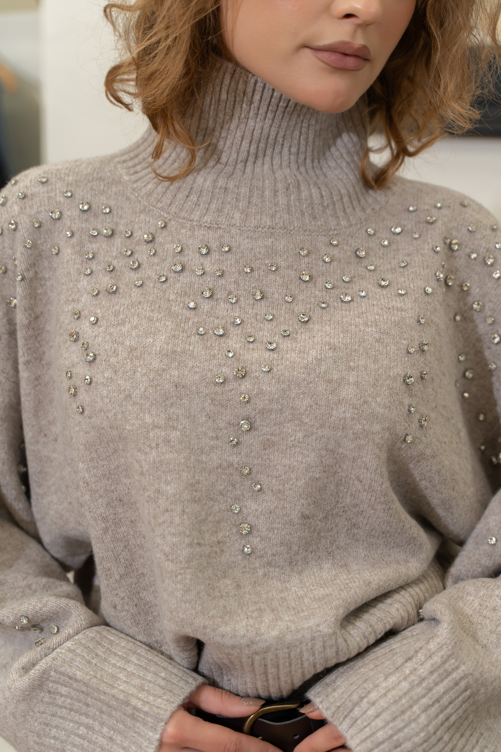 Pulover călduros cu guler înalt, decorat cu perle aplicate pentru un plus de eleganță. Croială lejeră și material moale, ideal pentru ținute casual-chic în sezonul rece.