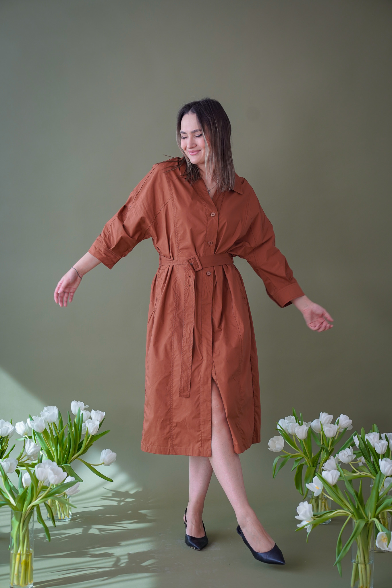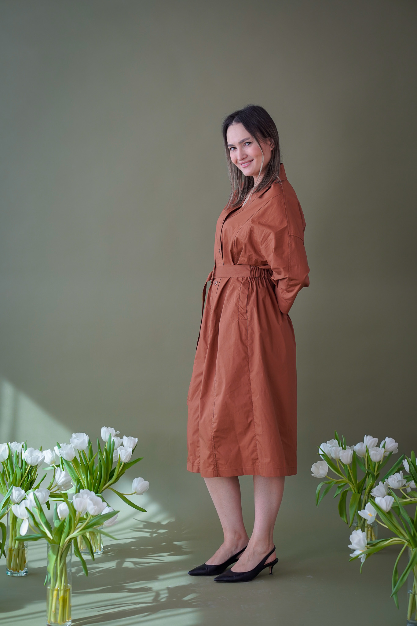 Simplitatea întâlnește eleganța în această rochie cărămizie, cu talie delicat conturată de cordon și mâneci trei sferturi. Croiala lejeră creează un aer feminin și sofisticat, iar detaliile subtile, precum nasturii frontali, adaugă rafinament. Ideală pentru zile în care vrei să te simți elegantă fără efort.